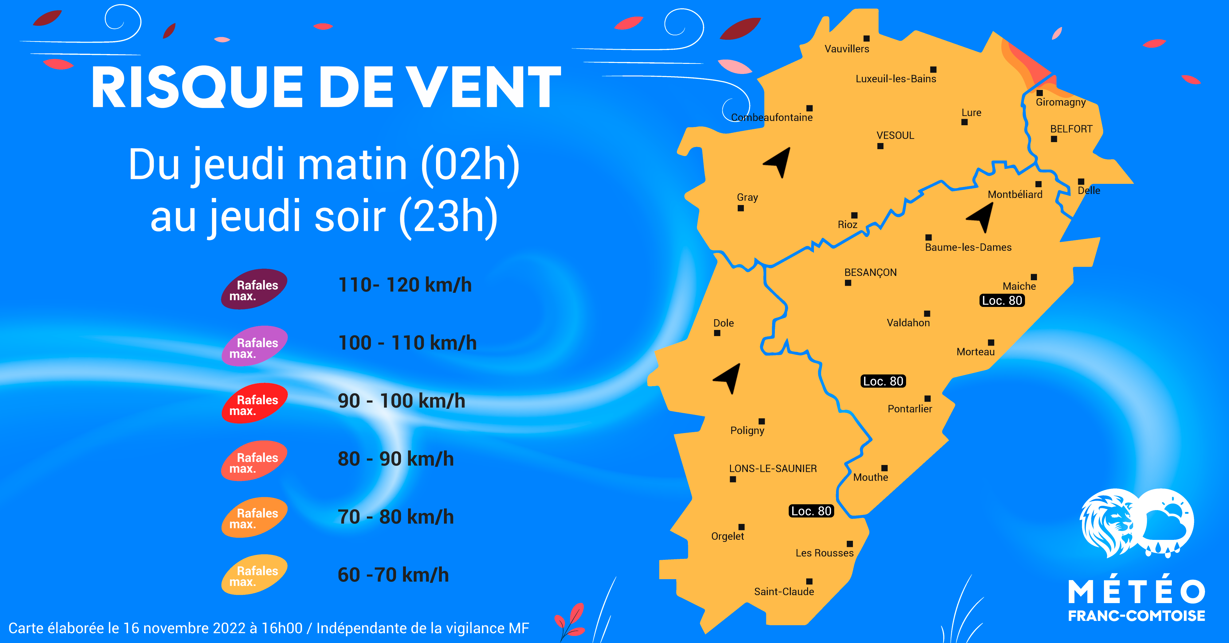 Puis les rafales faiblissent jeudi l’après-midi (très légèrement) mais restent largement présentes et des averses continuent de circuler dans les départements de la Franche-Comté.